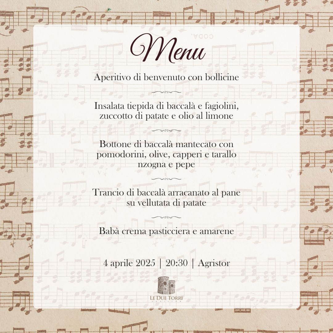 📜 Qui trovi il menu della serata, pensato per esaltare il baccalà in tutte le sue sfumature, accompagnato dalle note del Trio Posteggia, che ci regalerà l’atmosfera autentica della nostra Napoli.